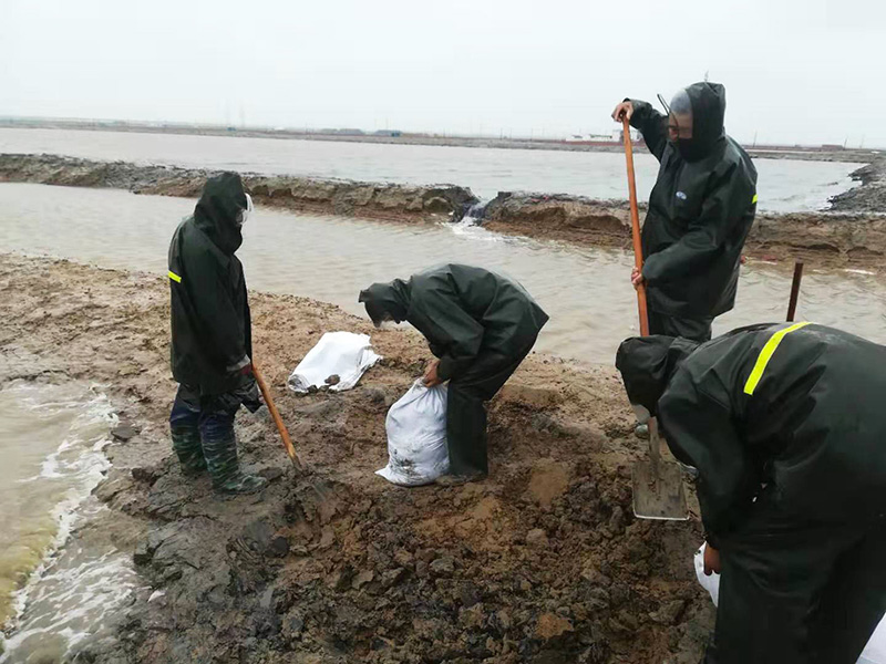 各生產單元及有關職能部門組織帶領1000多名職工自9日至12日,連續(xù)四個晝夜嚴密監(jiān)控,嚴防死守。其間,防汛辦公室按照渤海新區(qū)防汛部門指示和滄鹽集團防汛指揮部要求,多次組織召開防汛專題會議并安排部署防汛措施,關鍵時刻調用6臺挖掘機筑埝增高36處共計1865米,搶險疏通堵卡攔壩24處,同時采取了拉閘停電禁止外排淡水的超常措施。暴風雨中為提高泄洪排放量,通過現(xiàn)場冒雨勘查,制定了通過軍鹽路景觀河、中疏港路上另辟排淡渠道的決策,現(xiàn)場新開挖四處排淡應急溝道工程,為緩解排淡壓力,避免淡水漫灘贏得了寶貴時間,更為新區(qū)、園區(qū)化工企業(yè)財產安全奠定了技術保障。在搶險抗災的緊要關頭,長蘆鹽業(yè)公司組織一線突擊隊員在風雨中砸樁、扛袋、護埝,嚴防死守,晝夜奮戰(zhàn)在抗災一線,以堅強的意志,不屈的精神,譜寫了又一曲抗災保產的壯歌。各部(處)室、子公司也按照滄鹽集團防汛指揮部的統(tǒng)一部署,緊緊圍繞防汛大局,全力做好保障工作。