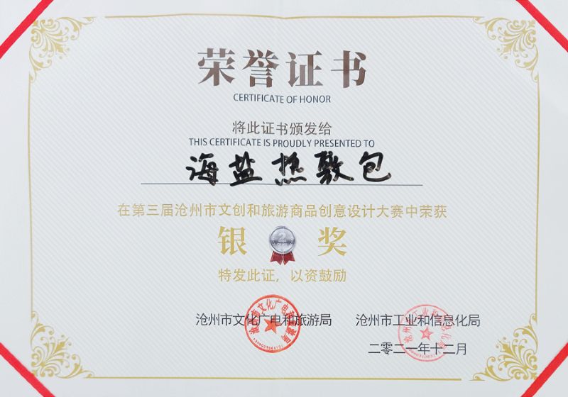 本次大賽是由滄州市文化廣電和旅游局、滄州市工業(yè)和信息化局聯(lián)合舉辦。在歷時(shí)6個(gè)月的比賽中,“滄鹽”牌海鹽熱敷包(宮廷款)最終脫穎而出,代表渤海新區(qū)進(jìn)入決賽,并經(jīng)過(guò)決賽路演、專家評(píng)審榮獲銀獎(jiǎng)。此獎(jiǎng)項(xiàng)也是渤海新區(qū)參賽商品中的最高獎(jiǎng)項(xiàng)。
