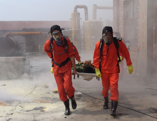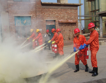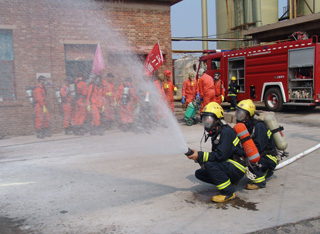 在模擬火災(zāi)現(xiàn)場,救援車輛滿載救援隊(duì)員及搶救器材、物資在第一時(shí)間進(jìn)入現(xiàn)場,救援人員使用干粉滅火器,對準(zhǔn)火源,迅速將火撲滅。與此同時(shí),在模擬液氯鋼瓶泄漏救援演練現(xiàn)場,液氯鋼瓶發(fā)生泄漏,救援人員一面組織現(xiàn)場人員用濕毛巾捂住口,向上風(fēng)口方向緊急疏散;一面佩戴專業(yè)空氣呼吸器,身著防化服,用液氯捕消器對泄漏源實(shí)施氯氣捕消和封堵,并將封堵后的鋼瓶由叉車送到液堿池進(jìn)行中和處理。在救援過程中,現(xiàn)場有一人氯氣中毒,現(xiàn)場總指揮立即派出4名救援隊(duì)員用擔(dān)架將傷員移至安全地帶,并同時(shí)向醫(yī)療急救中心和消防大隊(duì)請求救援。隨后,救護(hù)車、消防車先后趕到,醫(yī)護(hù)人員迅速對受傷人員實(shí)施搶救,消防人員則馬上啟動(dòng)消防設(shè)施,進(jìn)行水霧空中噴灑,將空氣中的氯氣吸附,控制事故范圍。事故處理完畢后,經(jīng)現(xiàn)場毒氣檢測,空氣中氯氣含量降至安全水平。至此,2010年中鹽長蘆滄州鹽化集團(tuán)有限公司危險(xiǎn)化學(xué)品及消防應(yīng)急救援演練順利結(jié)束。