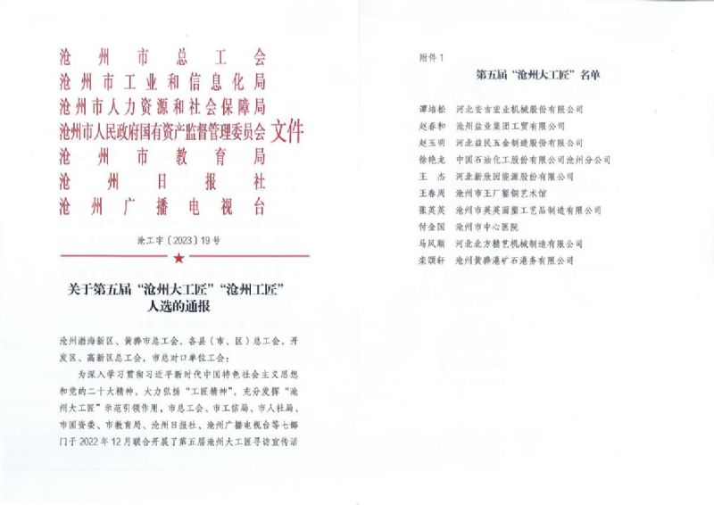 “滄州大工匠”是滄州市企業(yè)技能人才的至高榮譽(yù),評(píng)選活動(dòng)由市總工會(huì)、市工信局、市人社局、市國(guó)資委、市教育局、滄州日?qǐng)?bào)社、滄州廣播電視臺(tái)等七部門(mén)于 2022 年 12 月聯(lián)合開(kāi)展,面向全市企業(yè)長(zhǎng)期堅(jiān)守生產(chǎn)一線(xiàn)、從事技能工作的技工精英;顒(dòng)最終評(píng)選出滄州大工匠10名,滄州工匠10名。