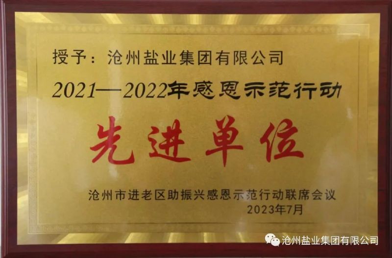 2023年7月,集團(tuán)公司被滄州市進(jìn)老區(qū)助振興感恩示范行動(dòng)聯(lián)席會(huì)議授予“2021—2022年感恩示范行動(dòng)先進(jìn)單位”榮譽(yù)稱號。