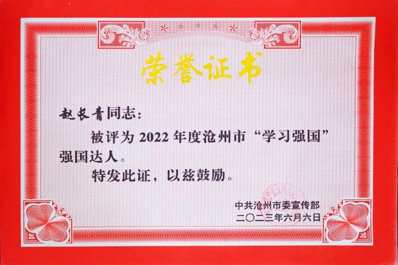 在“學(xué)習(xí)強(qiáng)國”滄州學(xué)習(xí)平臺(tái)上線兩周年之際,滄州市委宣傳部下發(fā)了關(guān)于評(píng)選全市“強(qiáng)國達(dá)人”的通知,在全市范圍內(nèi),以總學(xué)習(xí)積分為標(biāo)準(zhǔn)評(píng)選“強(qiáng)國達(dá)人”。截至5月20日,我公司共有30多名職工學(xué)習(xí)總積分和年度學(xué)習(xí)積分達(dá)到初評(píng)條件。最終,趙長青憑借總積分優(yōu)勢被評(píng)選為滄州市“強(qiáng)國達(dá)人”。