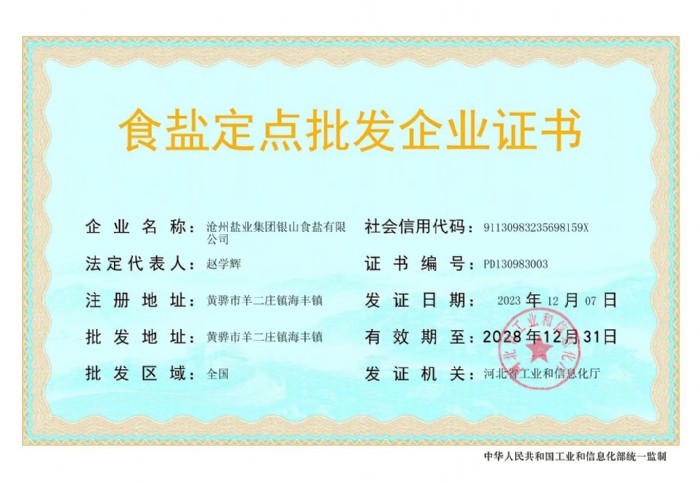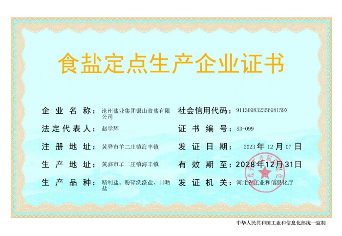 近日,銀山食鹽有限公司順利完成食鹽定點生產企業(yè)(證書編號SD-099)和食鹽定點批發(fā)企業(yè)(證書編號PD130983003)兩證審核換發(fā)工作。12月19日,河北省工業(yè)和信息化廳向銀山食鹽有限公司頒發(fā)了新換發(fā)的兩個證書。