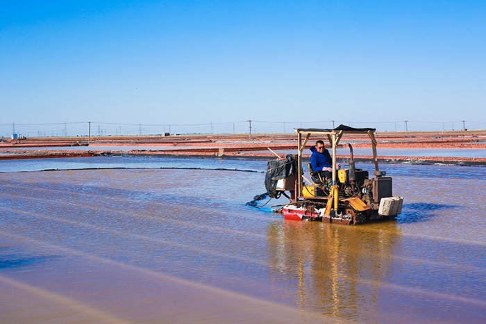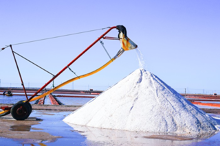 青鋒公司鹽區(qū)四副灘同時開耙,扒鹽、活茬全部采用機(jī)械作業(yè)。目前,鹵水充足,每天可完成2個結(jié)晶池收鹽。