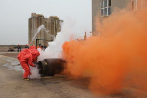 與此同時,在模擬液氯鋼瓶泄漏救援演練現(xiàn)場,液氯鋼瓶發(fā)生泄漏,工作人員立即拉響警報器,救援人員一面組織現(xiàn)場人員用濕毛巾捂住口鼻,向上風(fēng)口方向緊急疏散;一面佩戴專業(yè)空氣呼吸器,身著防化服,破開車間門、窗,用液氯捕消器對泄漏源實施捕消和封堵。救援人員發(fā)現(xiàn)現(xiàn)場有一人氯氣中毒后,立即報告給演練指揮中心,指揮中心立即派出2名救援隊員用擔(dān)架將傷者移至安全地帶,并組織醫(yī)護(hù)人員迅速對傷者實施搶救。消防人員則馬上啟動消防設(shè)施,進(jìn)行水霧空中噴灑,中和、吸附泄漏到空氣中的氯氣,降低危害程度,控制事故范圍。事故處理完畢后,經(jīng)現(xiàn)場毒氣檢測,空氣中氯氣含量降至安全水平。至此,中鹽長蘆滄州鹽化集團(tuán)有限公司2013年應(yīng)急救援實戰(zhàn)大演練到此結(jié)束。
