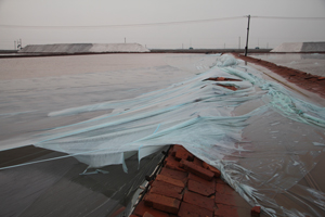 此次災(zāi)害性天氣,造成公司生產(chǎn)場(chǎng)區(qū)大面積結(jié)晶塑膜被毀,部分苫封鹽膜被掀。盡管各生產(chǎn)單元組織人員頂風(fēng)冒雨對(duì)刮開(kāi)撕裂的結(jié)晶池塑膜進(jìn)行了緊急搶修,但由于塑膜受損面積大,仍造成部分結(jié)晶池鹵水嚴(yán)重稀釋?zhuān)卮纣}受到一定程度的損失,給即將到來(lái)的汛前制鹵工作帶來(lái)困難,對(duì)塑苫池雨季曬鹽造成嚴(yán)重威脅。據(jù)統(tǒng)計(jì),因颶風(fēng)撕裂損壞塑膜5763公畝,徹底報(bào)廢塑膜1140公畝,損壞滑道10160米,浮板1901米,宿舍、機(jī)房頂瓦被掀5500塊,長(zhǎng)度約1200米的鹽碼苫封塑膜被徹底損毀。