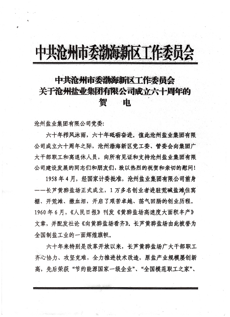 滄州渤海新區(qū)黨工委、管委會(huì)發(fā)來賀電,對公司成立六十周年表示祝賀,對公司過往取得的輝煌成就予以充分肯定,并寄望滄鹽集團(tuán)繼續(xù)發(fā)揚(yáng)滄鹽精神,深化改革,加快推進(jìn)轉(zhuǎn)型升級(jí),助力滄州渤海新區(qū)高質(zhì)量發(fā)展。